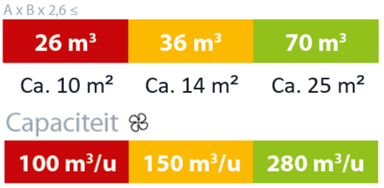 Zo is dus te zien hoe groot de ventilator moet zijn voor de beoogde ruimte!